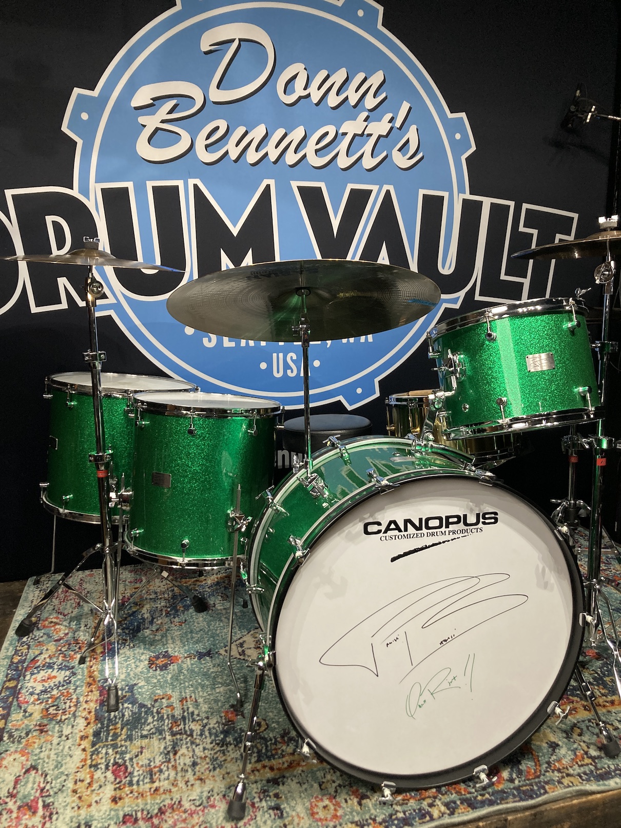 Frankie Banali’s Quiet Riot, Canopus 4-Piece Set, 26″, 18″, 16″, 14″ , 6.5×14 Brass Snare. 2010 – Green Sparkle, Bonham Sizes! With Hardware and Frankie’s Stick Bag! image 23